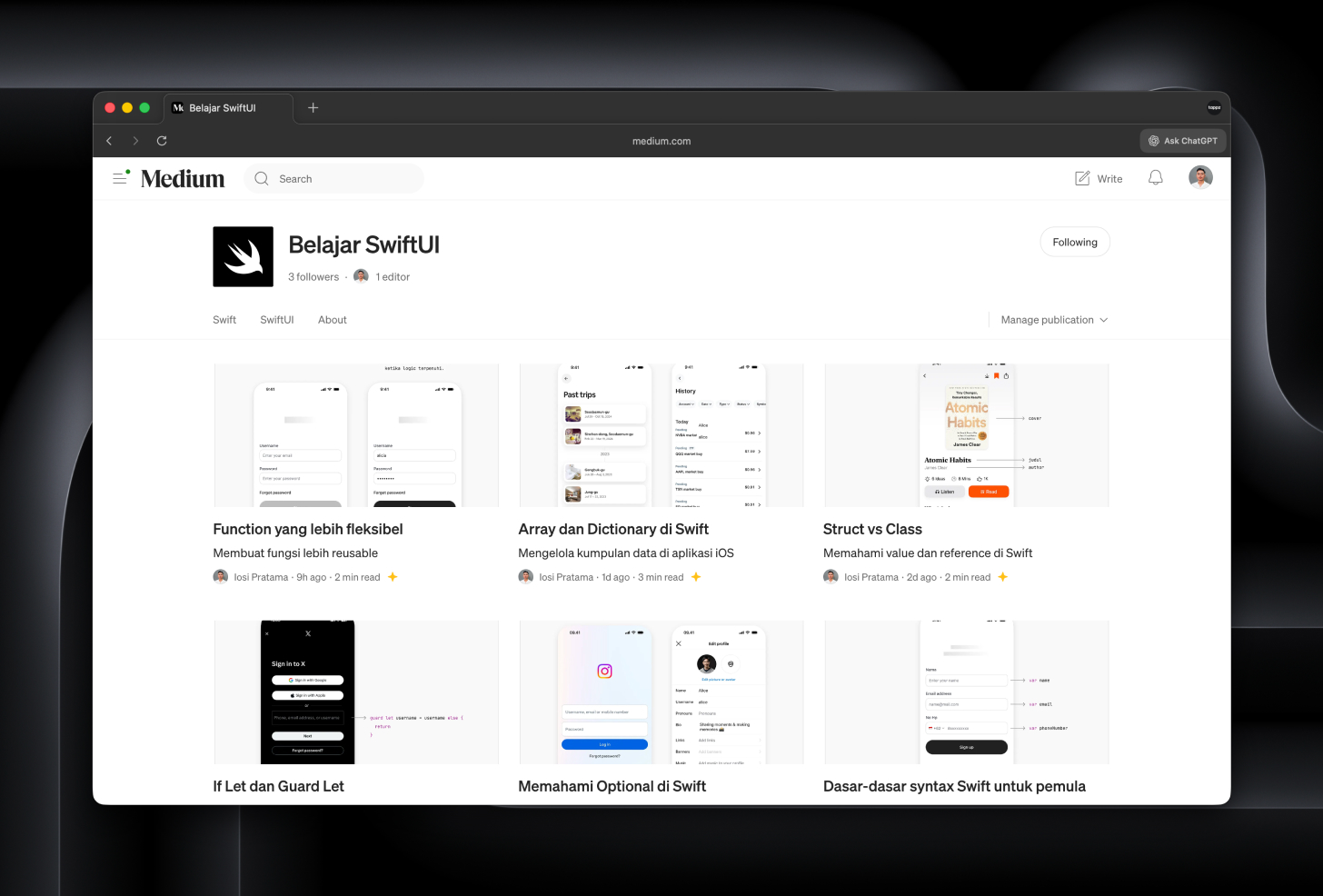 Semingguan terakhir nulis seputar belajar Swift di publikasi Belajar SwiftUI.